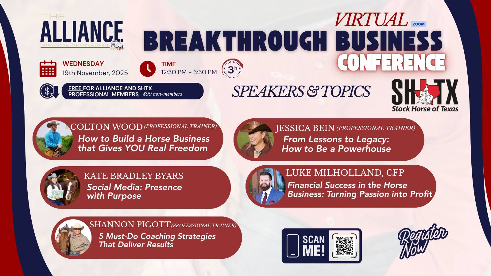 The business conference is free for Alliance members. We’ve also partnered with our friends at Stock Horse of Texas (SHTX) so that SHTX Professional Horsemen may attend free as well.
